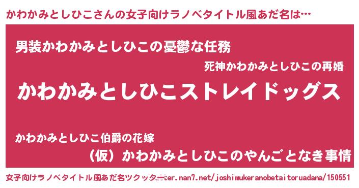 | 男性向けラノベタイトル風あだ名 | 『Re:かわかみとしひこから始める異世界生活』 |