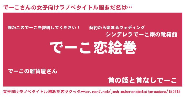 | 男性向けラノベタイトル風あだ名 | 『おまえをオタクにしてやるから、俺をでーこにしてくれ! 』 |