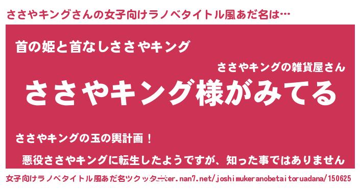 | 男性向けラノベタイトル風あだ名 | 『ささやキングの嫁は女の子じゃないと思った?』 |
