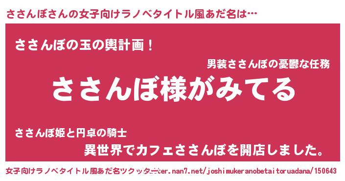 | 男性向けラノベタイトル風あだ名 | 『ささんぼの嫁は女の子じゃないと思った?』 |