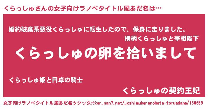| 男性向けラノベタイトル風あだ名 | 『くらっしゅの嫁は女の子じゃないと思った?』 |