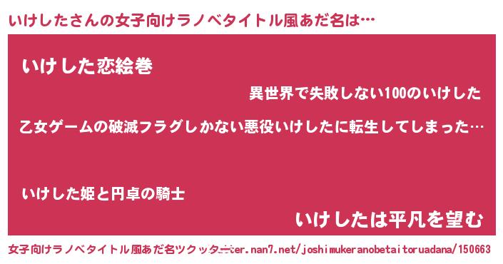 | 男性向けラノベタイトル風あだ名 | 『この素晴らしい世界にいけしたを!』 |