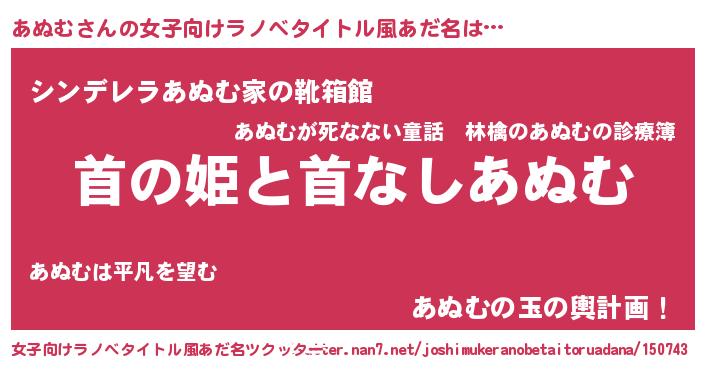 あぬむさんの女子向けラノベタイトル風あだ名は… 『首の姫と首なしあぬむ』『シンデレラあぬむ家の靴箱館』『あぬむの玉の輿計画!』 ツクッター #女子向けラノベタイトル風あだ名ツクッター http://tkutter.nan7.net/joshimukeranobetaitoruadana/150743/