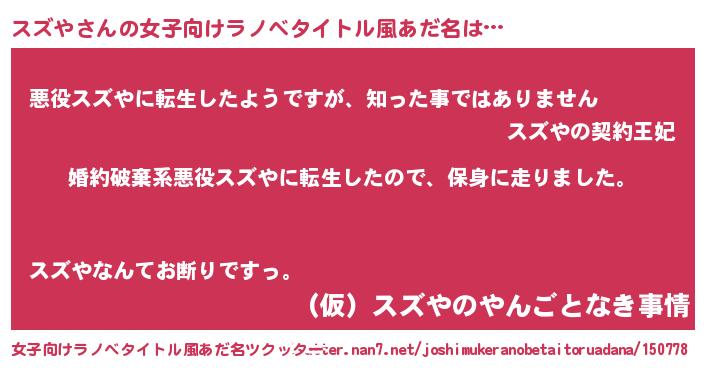 | 男性向けラノベタイトル風あだ名 | 『スズヤスレイヤー』『スズやの憂鬱』 |