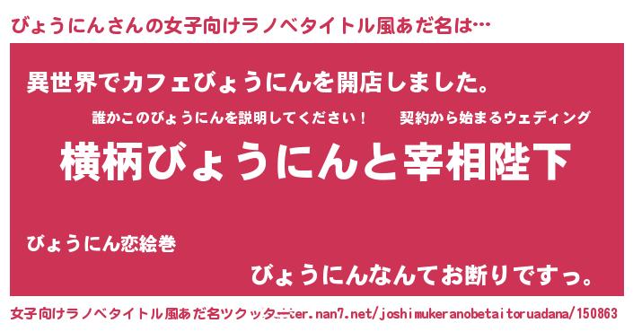 びょうにんさんの女子向けラノベタイトル風あだ名は… 『横柄びょうにんと宰相陛下』『異世界でカフェびょうにんを開店しました。』『びょうにんなんてお断りですっ。』 ツクッター #女子向けラノベタイトル風あだ名ツクッター http://tkutter.nan7.net/joshimukeranobetaitoruadana/150863/