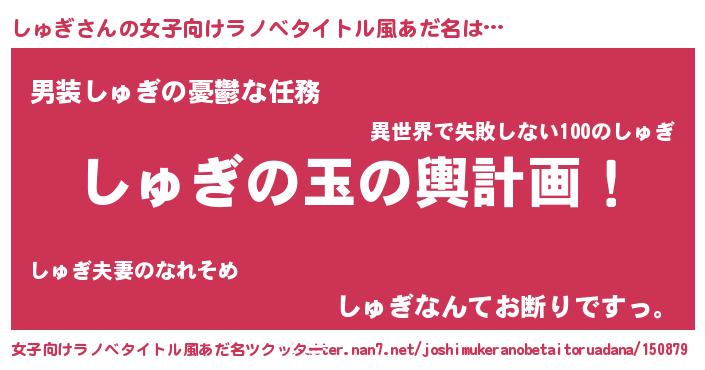 | 男性向けラノベタイトル風あだ名 | 『しゅぎ~年齢イコール彼女いない歴の魔法使い~』 |
