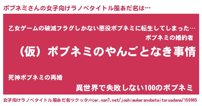 | 男性向けラノベタイトル風あだ名 | 『ボブネミの憂鬱』『魔弾の王とボブネミ』 |