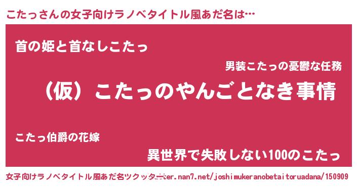 | 男性向けラノベタイトル風あだ名 | 『こたっの憂鬱』『はたらくこたっさま!』 |