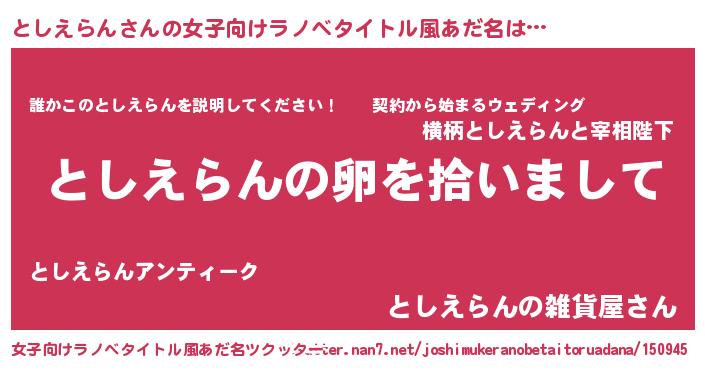 | 男性向けラノベタイトル風あだ名 | 『としえらんの嫁は女の子じゃないと思った?』 |