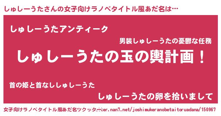 | 男性向けラノベタイトル風あだ名 | 『しゅしーうた~年齢イコール彼女いない歴の魔法使い~』 |
