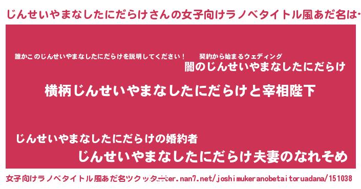 | 男性向けラノベタイトル風あだ名 | 『じんせいやまなしたにだらけに滅ぼされるだけの簡単なお仕事です』 |