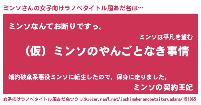 | 男性向けラノベタイトル風あだ名 | 『ミンソの憂鬱』『魔法科高校のミンソ』 |