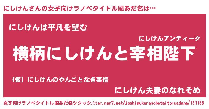 にしけんさんの女子向けラノベタイトル風あだ名は… 『横柄にしけんと宰相陛下』『にしけんは平凡を望む』『にしけん夫妻のなれそめ』 ツクッター #女子向けラノベタイトル風あだ名ツクッター http://tkutter.nan7.net/joshimukeranobetaitoruadana/151158/