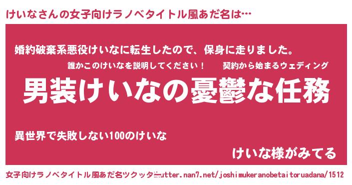 | 男性向けラノベタイトル風あだ名 | 『うちのけいなが世界を掌握している!』 |