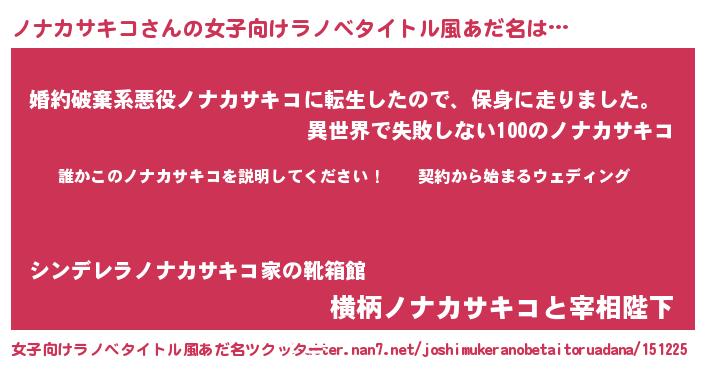 ノナカサキコさんの女子向けラノベタイトル風あだ名は… 『誰かこのノナカサキコを説明してください! ~契約から始まるウェディング~』『婚約破棄系悪役ノナカサキコに転生したので、保身に走りました。』『横柄ノナカサキコと宰相陛下』 ツクッター #女子向けラノベタイトル風あだ名ツクッター http://tkutter.nan7.net/joshimukeranobetaitoruadana/151225/