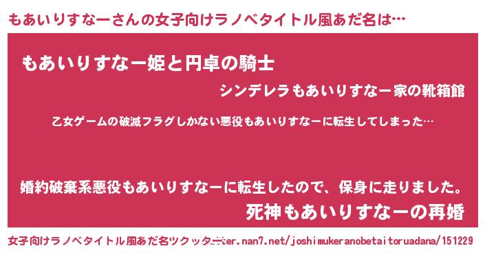 もあいりすなーさんの女子向けラノベタイトル風あだ名は… 『乙女ゲームの破滅フラグしかない悪役もあいりすなーに転生してしまった…』『もあいりすなー姫と円卓の騎士』『死神もあいりすなーの再婚』 ツクッター #女子向けラノベタイトル風あだ名ツクッター http://tkutter.nan7.net/joshimukeranobetaitoruadana/151229/
