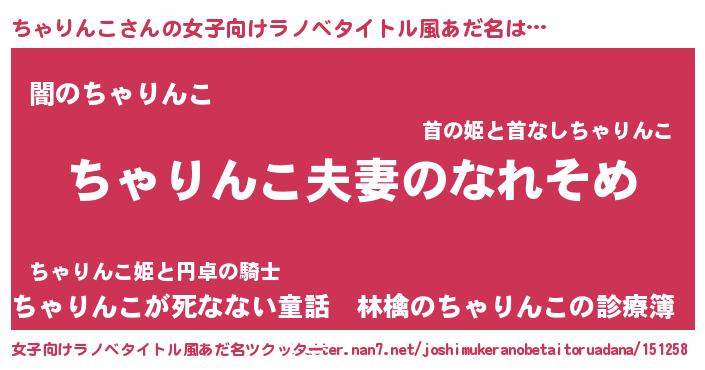 | 男性向けラノベタイトル風あだ名 | 『おまえをオタクにしてやるから、俺をちゃりんこにしてくれ! 』 |