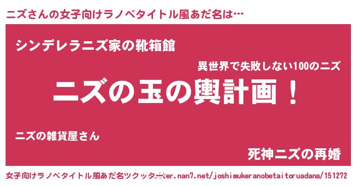 | 男性向けラノベタイトル風あだ名 | 『ニズ~年齢イコール彼女いない歴の魔法使い~』 |