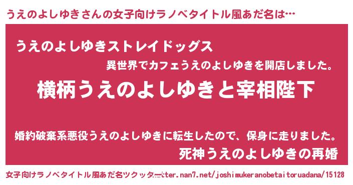 | 男性向けラノベタイトル風あだ名 | 『うえのよしゆきに滅ぼされるだけの簡単なお仕事です』 |