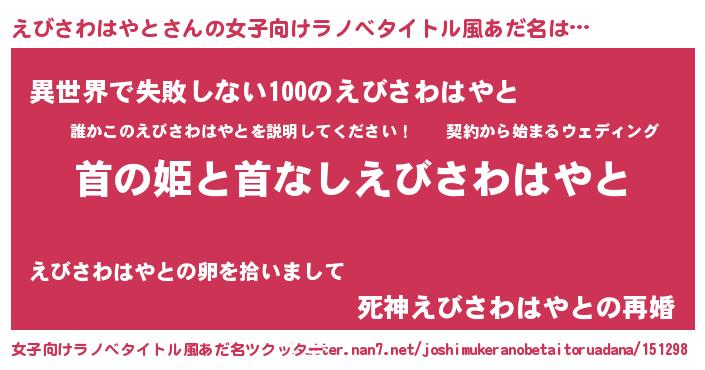 | 胡散臭い通販商品みたいなあだ名 | 『絶対に幸福をもたらす健康食品…その名も「えびさわはやと」』 |
