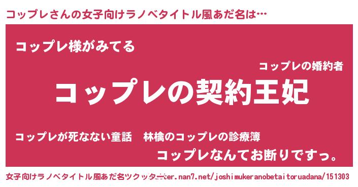 | 男性向けラノベタイトル風あだ名 | 『コップレという概念が存在しない退屈な世界 』 |