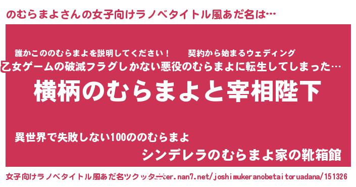 | 男性向けラノベタイトル風あだ名 | 『のむらまよに滅ぼされるだけの簡単なお仕事です』 |