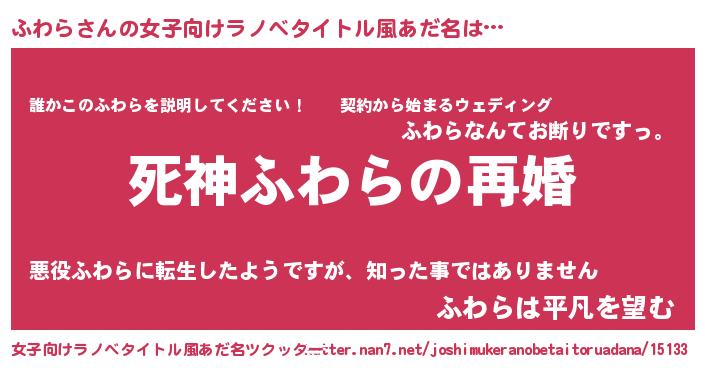 ふわらさんの女子向けラノベタイトル風あだ名は… 『死神ふわらの再婚』『誰かこのふわらを説明してください! ~契約から始まるウェディング~』『ふわらは平凡を望む』 ツクッター #女子向けラノベタイトル風あだ名ツクッター http://tkutter.nan7.net/joshimukeranobetaitoruadana/15133/