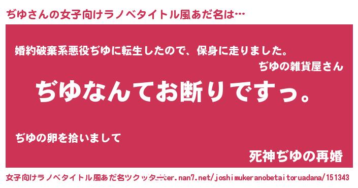 ぢゆさんの女子向けラノベタイトル風あだ名は… 『ぢゆなんてお断りですっ。』『婚約破棄系悪役ぢゆに転生したので、保身に走りました。』『死神ぢゆの再婚』 ツクッター #女子向けラノベタイトル風あだ名ツクッター http://tkutter.nan7.net/joshimukeranobetaitoruadana/151343/