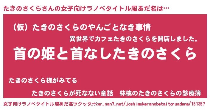 たきのさくらさんの女子向けラノベタイトル風あだ名は… 『首の姫と首なしたきのさくら』『(仮)たきのさくらのやんごとなき事情』『たきのさくらが死なない童話 林檎のたきのさくらの診療簿』 ツクッター #女子向けラノベタイトル風あだ名ツクッター http://tkutter.nan7.net/joshimukeranobetaitoruadana/151357/