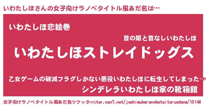 | 男性向けラノベタイトル風あだ名 | 『Re:いわたしほから始める異世界生活』 |