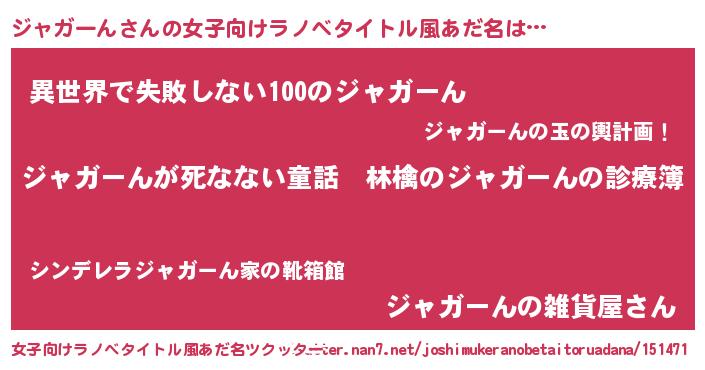 | 男性向けラノベタイトル風あだ名 | 『魔弾の王とジャガーん』 |