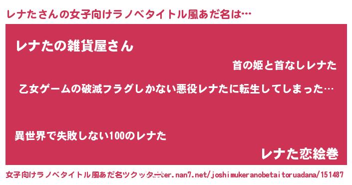 レナたさんの女子向けラノベタイトル風あだ名は… 『乙女ゲームの破滅フラグしかない悪役レナたに転生してしまった…』『レナたの雑貨屋さん』『レナた恋絵巻』 ツクッター #女子向けラノベタイトル風あだ名ツクッター http://tkutter.nan7.net/joshimukeranobetaitoruadana/151487/