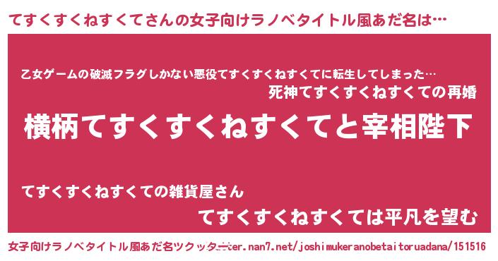 | 男性向けラノベタイトル風あだ名 | 『てすくすくねすくてに滅ぼされるだけの簡単なお仕事です』 |