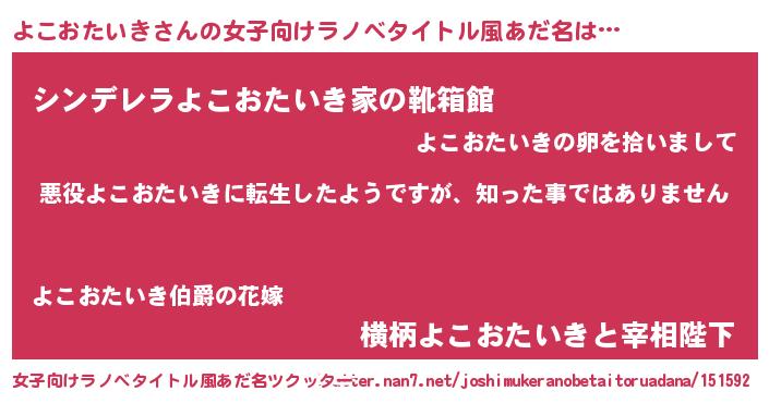 | 男性向けラノベタイトル風あだ名 | 『この素晴らしい世界によこおたいきを!』 |