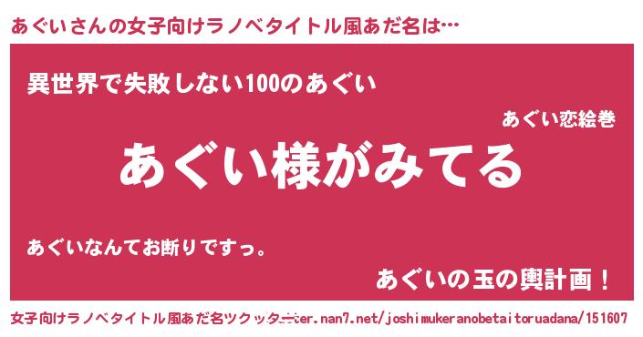 | 男性向けラノベタイトル風あだ名 | 『あぐいの嫁は女の子じゃないと思った?』 |