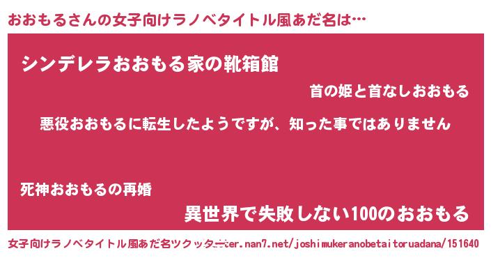 | 男性向けラノベタイトル風あだ名 | 『この素晴らしい世界におおもるを!』 |