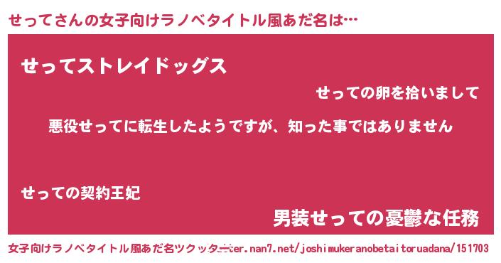 | 男性向けラノベタイトル風あだ名 | 『この素晴らしい世界にせってを!』 |