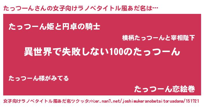 | 男性向けラノベタイトル風あだ名 | 『たっつーんという概念が存在しない退屈な世界 』 |