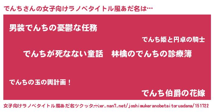 | 男性向けラノベタイトル風あだ名 | 『魔弾の王とでんち』 |