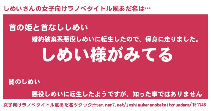 | 男性向けラノベタイトル風あだ名 | 『しめいの嫁は女の子じゃないと思った?』 |