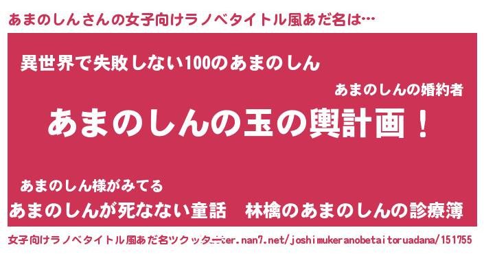 | 男性向けラノベタイトル風あだ名 | 『あまのしん~年齢イコール彼女いない歴の魔法使い~』 |