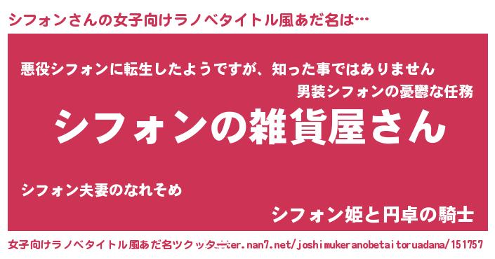 シフォンさんの女子向けラノベタイトル風あだ名は… 『シフォンの雑貨屋さん』『悪役シフォンに転生したようですが、知った事ではありません』『シフォン姫と円卓の騎士』 ツクッター #女子向けラノベタイトル風あだ名ツクッター http://tkutter.nan7.net/joshimukeranobetaitoruadana/151757/