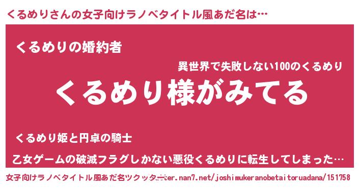 | 男性向けラノベタイトル風あだ名 | 『くるめりの嫁は女の子じゃないと思った?』 |