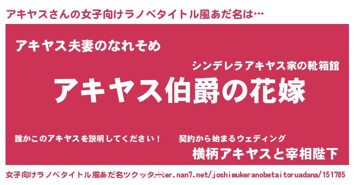 | 男性向けラノベタイトル風あだ名 | 『うちの娘の為ならば、俺はもしかしたらアキヤスも倒せるかもしれない。』 |