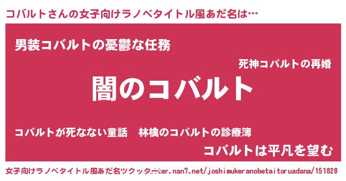 コバルトさんの女子向けラノベタイトル風あだ名は… 『闇のコバルト』『男装コバルトの憂鬱な任務』『コバルトは平凡を望む』 ツクッター #女子向けラノベタイトル風あだ名ツクッター http://tkutter.nan7.net/joshimukeranobetaitoruadana/151828/
