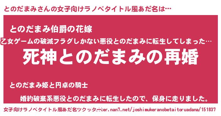 | ヒーロー風カッコイイあだ名 | 『慈愛の使者とのだまみ』『仮面トノダー』 |