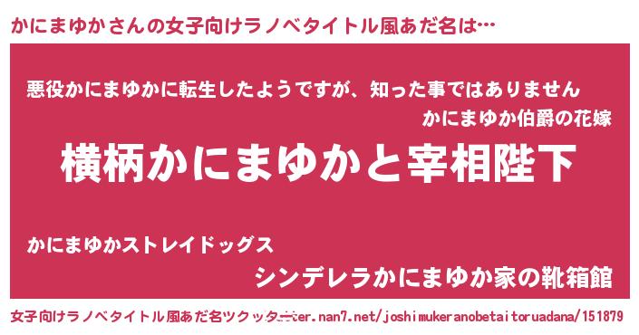 かにまゆかさんの女子向けラノベタイトル風あだ名は… 『横柄かにまゆかと宰相陛下』『悪役かにまゆかに転生したようですが、知った事ではありません』『シンデレラかにまゆか家の靴箱館』 ツクッター #女子向けラノベタイトル風あだ名ツクッター http://tkutter.nan7.net/joshimukeranobetaitoruadana/151879/