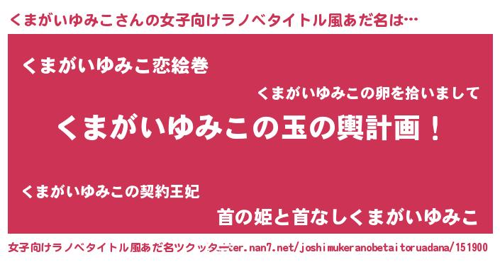 | 男性向けラノベタイトル風あだ名 | 『くまがいゆみこ~年齢イコール彼女いない歴の魔法使い~』 |