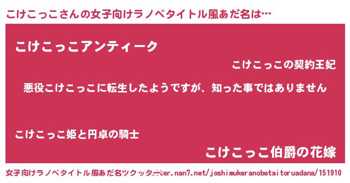 | 男性向けラノベタイトル風あだ名 | 『この素晴らしい世界にこけこっこを!』 |
