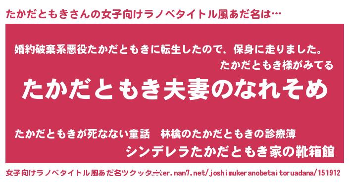 | 男性向けラノベタイトル風あだ名 | 『おまえをオタクにしてやるから、俺をたかだともきにしてくれ! 』 |